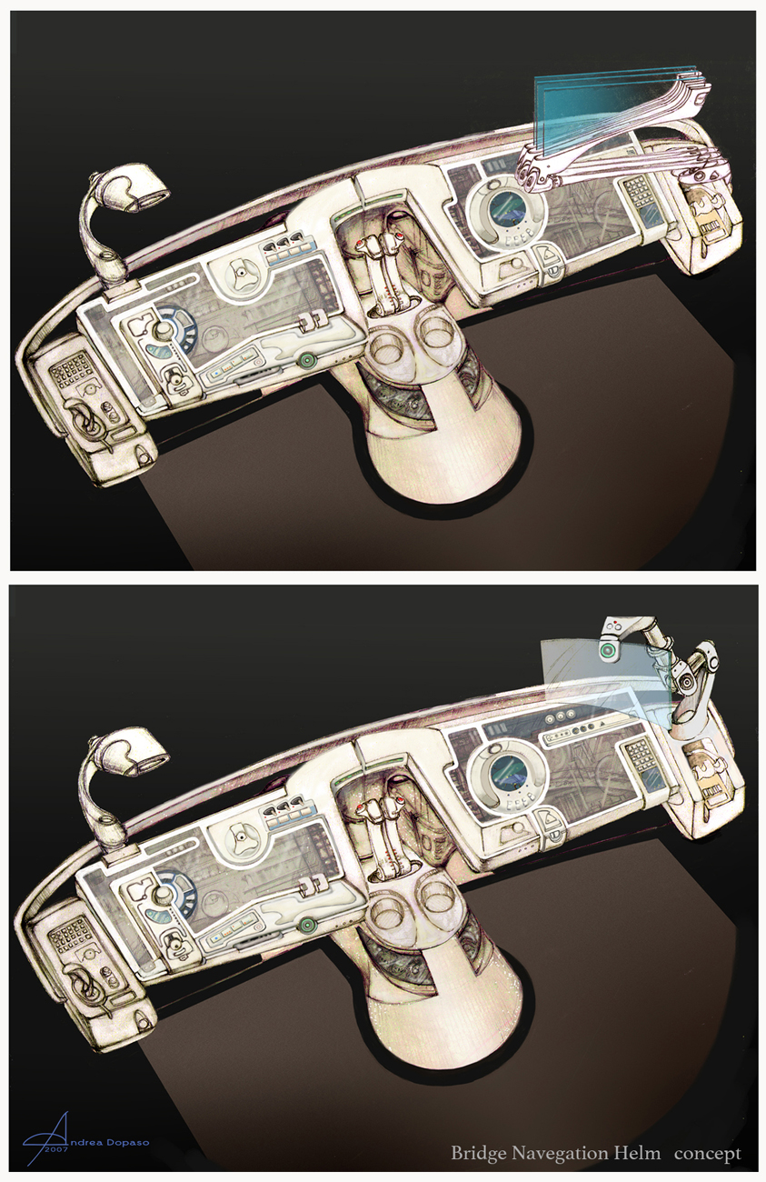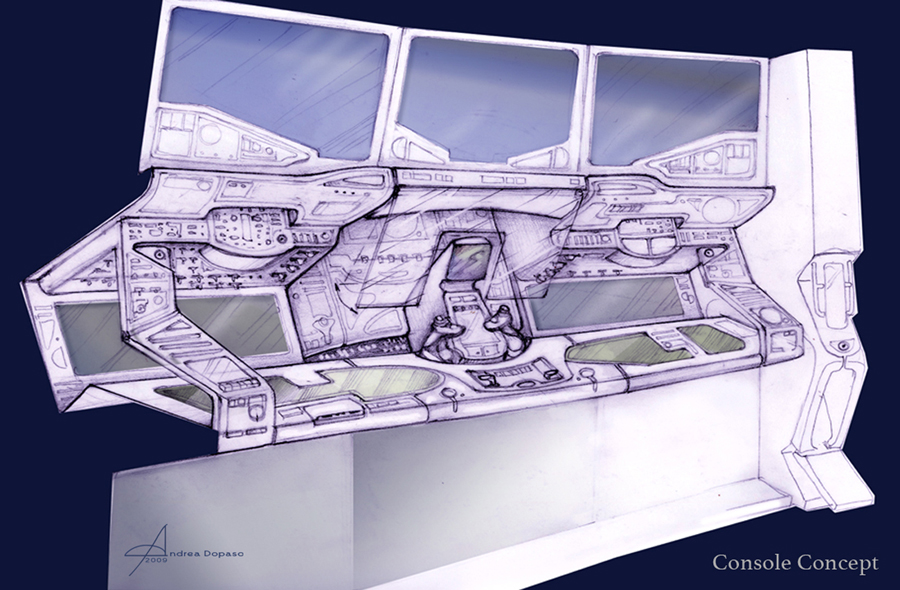 We were all trying different options and inspirations, I started by sketching simple console designs in pencil using as a reference an old car bumper,  the idea  evoked an old/modern feel,  and  lucky me one of them was the ticket!. J.J. love it and  I was thrilled. Then the same look spread to the other consoles, buttresses and hub, and the whole interior.